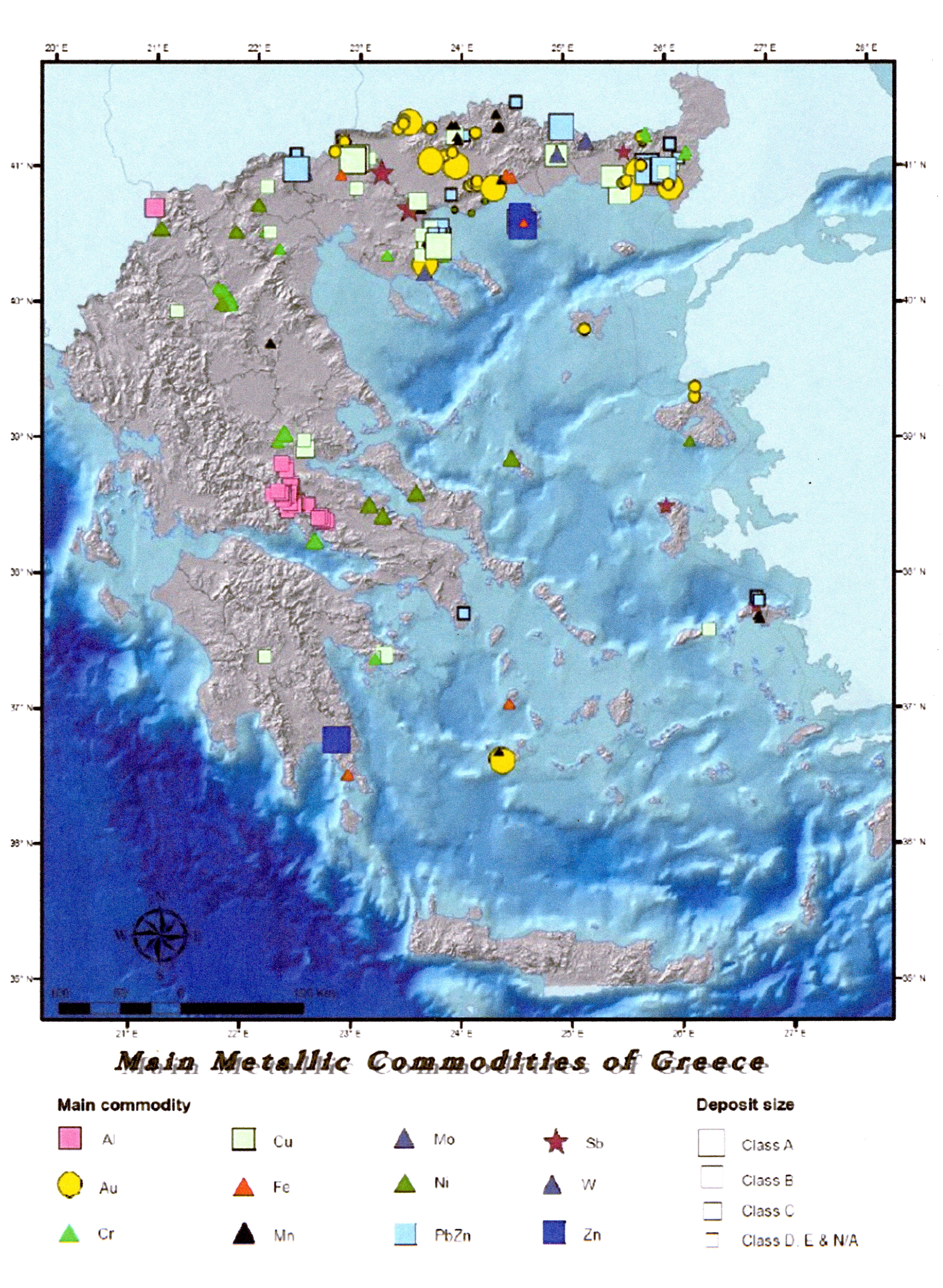 Greece has a large number of critical and strategic metal resources. The proven and indicated reserves of aluminum amount to 2.5 mt and their gross value €5.075 b. Those of chromium amount to 1.2 mt with gross value €4.320 b, while of cobalt are 129 th. t with gross value €3.348 b. The proven and indicated reserves of copper from Chalkidiki and Kilkis areas are approximately 3.04 mt and their gross value €24.776 b, while those of manganese are 2.25 mt with gross value €5.400 b. Molybdenum has been located in Pigi Kilkis with indicated reserves of about 7.7 th. t and gross value €326 m. Under mining are the vein type magnesite deposits of Gerakini Chalkidiki and North Evia. The total reserves (proven + indicated) of magnesite are 280 mt and their gross value €9.800 b. The most important lateritic Fe-Ni-bearing ores are those of Evia Island, Agios Ioannis Viotia, Lokrida Fthiotida, Mesopotamia and Ieropigi Kastoria. The proven and indicated reserves of nickel are 1.39 mt and their gross value €22.240 b. The Rizana/Lachanas porphyry-epithermal antimony deposit is considered the most important stibnite ore. The proven and indicated reserves of stibnite are at least 100 th. t with an average Sb content of 0.3 wt%. Copper, chromium, and cobalt present good prospects for mining. Platinum group metals (PGMs), with economic interest, are contained in the porphyry Cu deposits of Skouries Chalkidiki. Strymonikos Gulf, together with the neighboring coastal and submarine sands, is the most probable area for locating exploitable rare earth metals (REMs). There are excellent investment opportunities in the exploration and mining of Bi, Te, Ga, Ge, and In metals. The deposits of other critical and strategic metals of Greece should be adequately assessed.